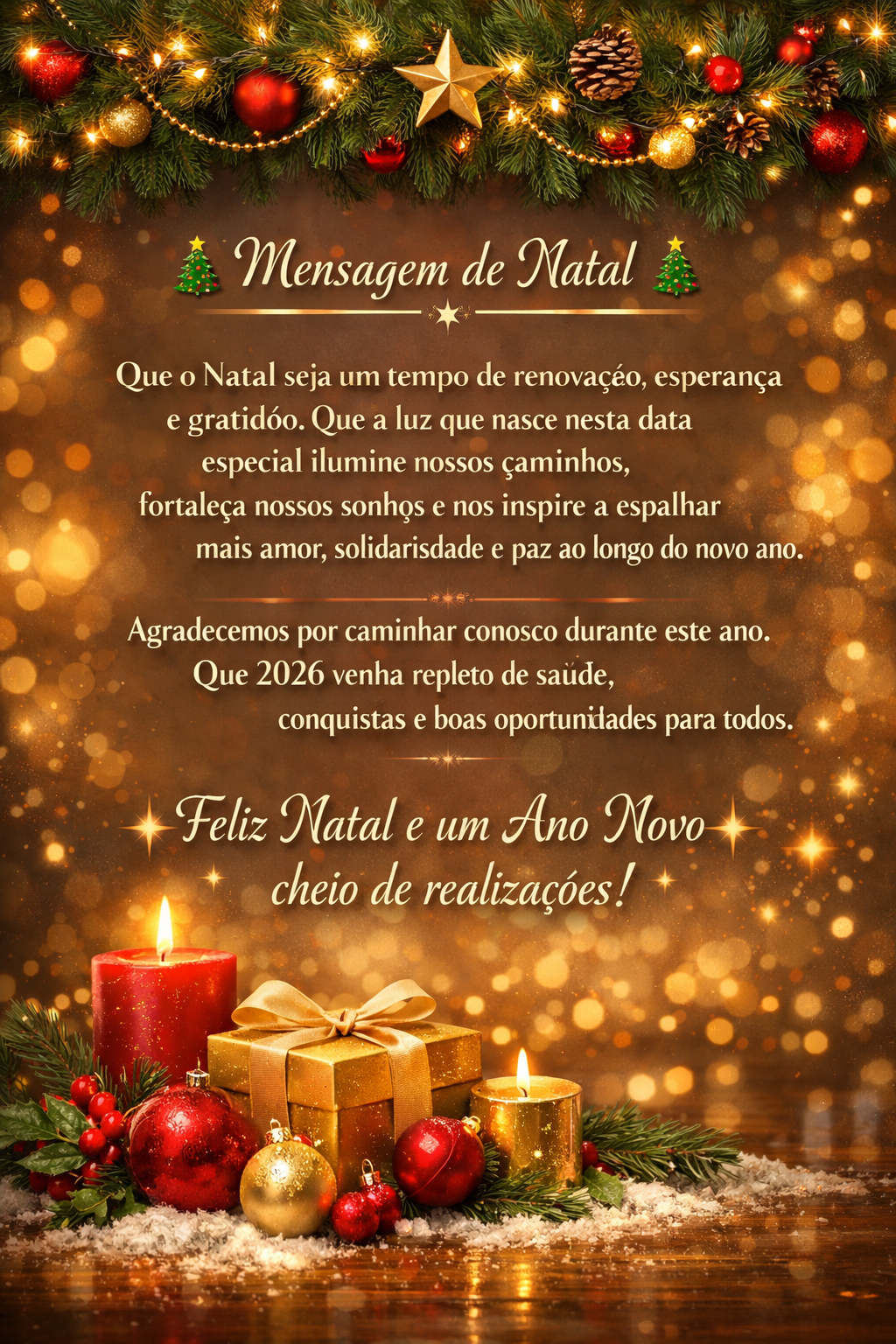 Agradecemos por caminhar conosco durante este ano. Que 2026 venha repleto de saúde, conquistas e boas oportunidades para todos.