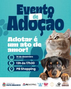 A Prefeitura Municipal de Pato Branco, por meio da Secretaria Municipal de Meio Ambiente, promove no domingo (14), mais um Evento de Adoção de cães e gatos. A ação irá ocorrer das 13h às 17h30, no PB Shopping.