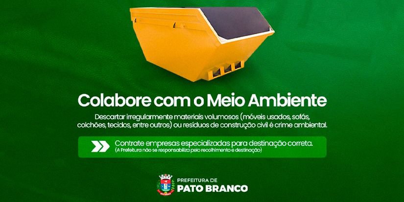 A Prefeitura de Pato Branco, por meio da Secretaria Municipal de Meio Ambiente, reforça que o descarte de resíduos de construção civil (RCC) e volumosos (descarte de móveis, sofás, colchões, tecidos) ao lado de contêineres, em frente a residências ou em vias públicas deve ser evitado, pois configura crime ambiental.