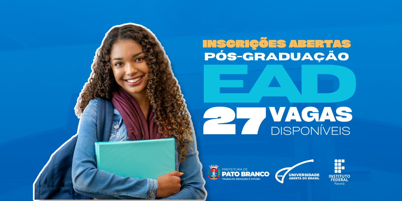 A Universidade Aberta do Brasil (UAB) – Polo Pato Branco está com inscrições abertas para o Processo Seletivo Simplificado para Admissão de Estudantes no curso de Pós-Graduação Lato Sensu – Especialização em Educação a Distância na Educação Profissional e Tecnológica (EaD na EPT), na Modalidade a Distância, em parceria com o Instituto Federal do Paraná (IFPR).